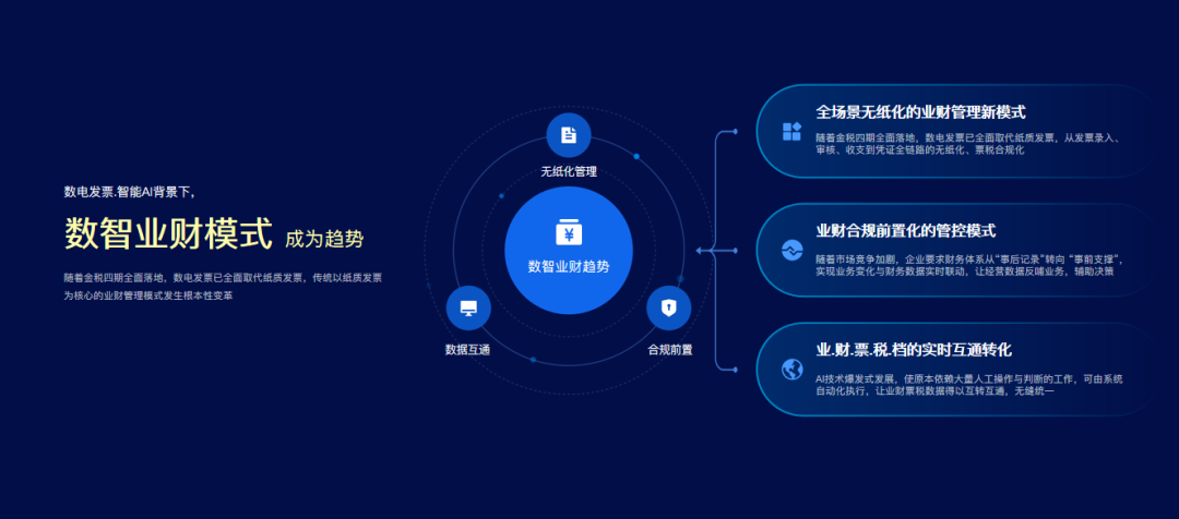 随着金税四期的全面落地,数电发票、电子签章、电子合同、电子档案在快速普及,智能AI技术在快速发展,传统业财管理模式正在改变。业.财.票.税.档的数据实时互通、自动转换,内控合规前置管控、成本费用收入自动核算的全流程数智化的业财新模式将成为趋势。