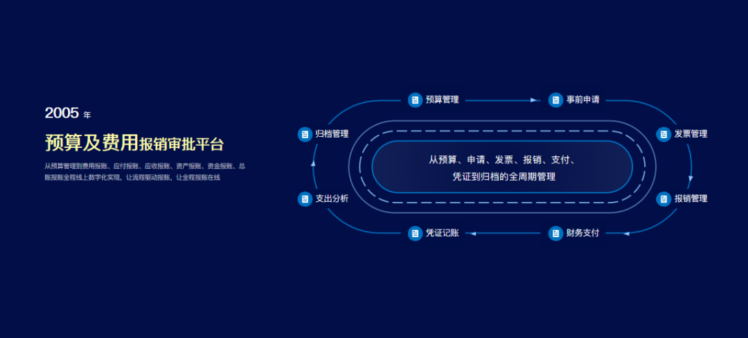 2005年,泛微在提供协同办公OA产品的同时,很多客户要求泛微解决费用报销的线下审核问题。于是,泛微在2005年发布了第一代的费用报销平台,将预算以及线下的报销审核流程搬到线上。平台帮助客户实现了从预算管理到费用报账、应付报账、应收报账、资产报账、资金报账、总账报账全程线上数字化,让流程驱动报账,实现全程在线报账。