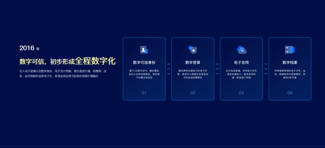 随着国家推广数字可信,客户逐渐开始关注数字可信身份,电子印章、电子合同、电子档案。所以在2016年,泛微发布了结合了数字可信技术的的业财平台,泛微将线下的合同、印章实现电子化,让原先无法在线上完成的工作,可以在线上完成。